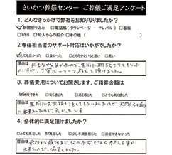 A:ご家族の方だけで送る『花送葬』ですと99,750円~となります。詳しくは、さいたま県民葬祭(さいかつ葬祭センター)までご相談ください。